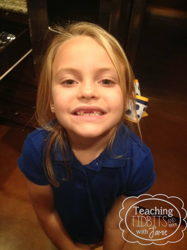 My own little cutie came home from school with both of her front teeth missing.  She is officially snaggletooth, but it is sure cute!!!
