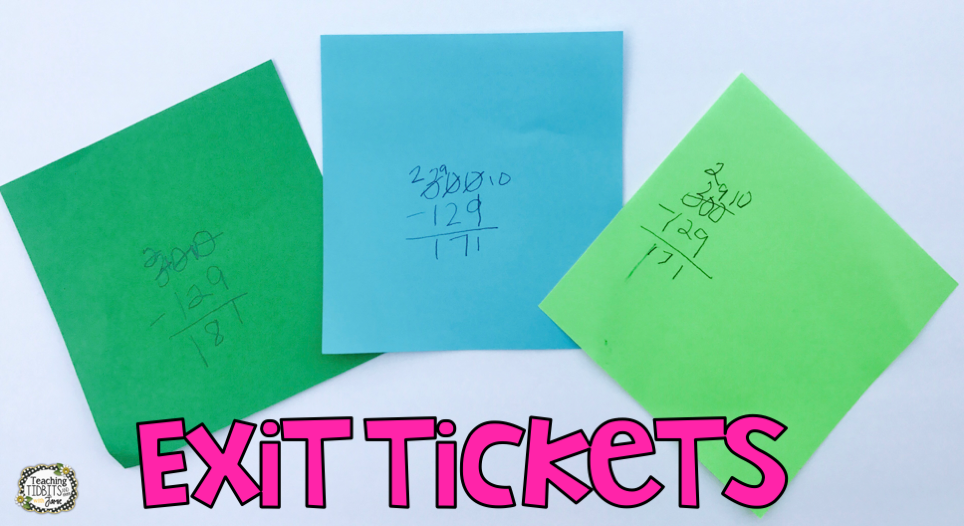 In the image below I posed the question 300-129 to my class. I wanted to check their regrouping skills. The exit ticket allowed me to clearly see where each child was messing up and where they were performing the skill correctly. I love to use this formative assessment in math.