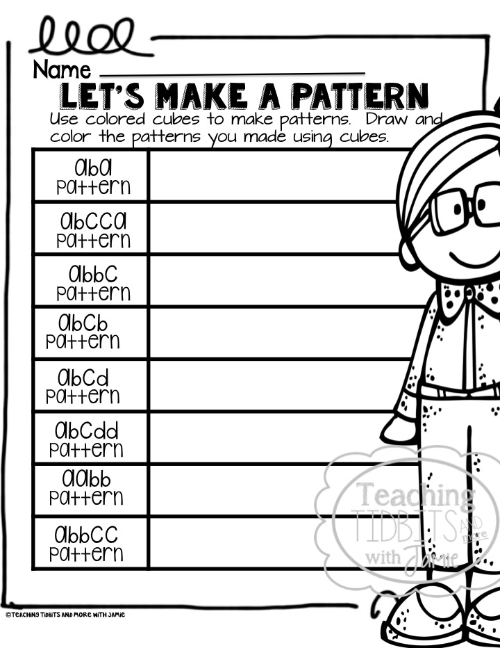 Unifix cubes can also be used to teach patterns.  You can start with simple patterns such as:  aabb, abab, or abc.  Once the student has mastered simple patterns, then have them approach more difficult repeating patterns such as:  abcdd, abbccda, or abaccdd.